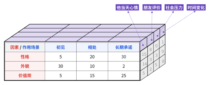 举例子,我继续把可能因素拆解为:初见、相处、长期承诺