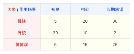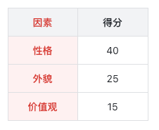 结果分数:喜欢程度=[性格:40,外貌:25,价值观:15]